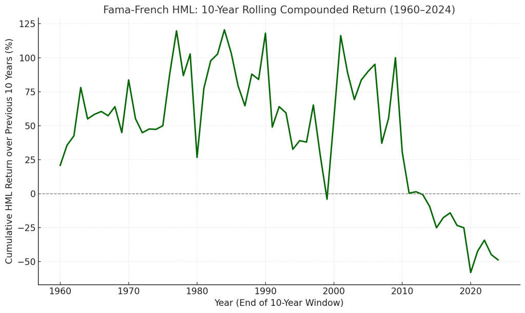 This reversal in the value factor has persisted. The HML has been negative since the rolling 10-year period beginning in 2014, largely due to the dominance of technology companies. They do not have as many durable assets such as land, capital, and equipment compared to sectors like manufacturing and finance. Instead, they hold assets that are less easily sold, such as intellectual property and licenses. This asset composition means their book value is relatively low, which is reflected in the negative HML since 2014.