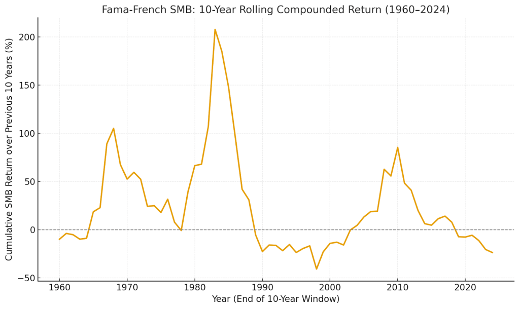The graph shows the SMB premium in cumulative rolling 10-year periods from 1960 to 2024. For example, the 1960 data represents the cumulative return of SMB from 1951 to 1960, while the 2024 data point shows the return from 2015 to 2024.