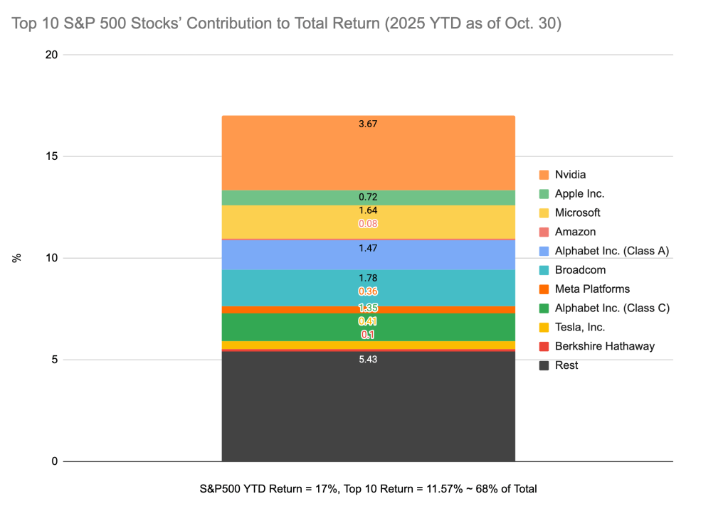 What is alarming is that in the S&P 500, nine out of the top ten companies are technology firms. Furthermore, these companies have a disproportionate share of the index’s total return, accounting for nearly 70% of it as of writing in late October, 2025.